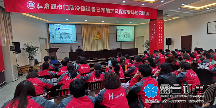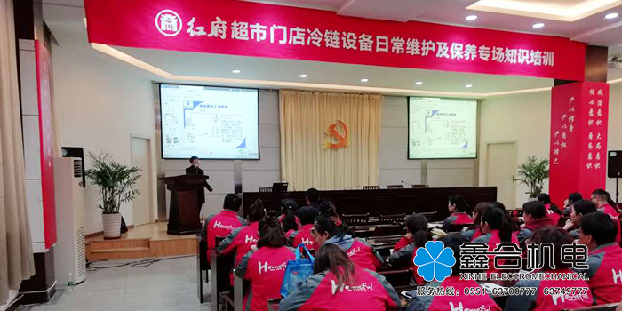 2019年3月29日,由安徽商之都紅府超市組織的《冷鏈設備日常維護及保養》專場培訓會在合肥召開。安徽鑫合機電設備有限公司溫曉慧總經理、商超事業部詹金保經理、張鵬經理應邀參加此次培訓會,并為紅府超市各門店店長及生鮮科科長進行制冷專業知識培訓。
